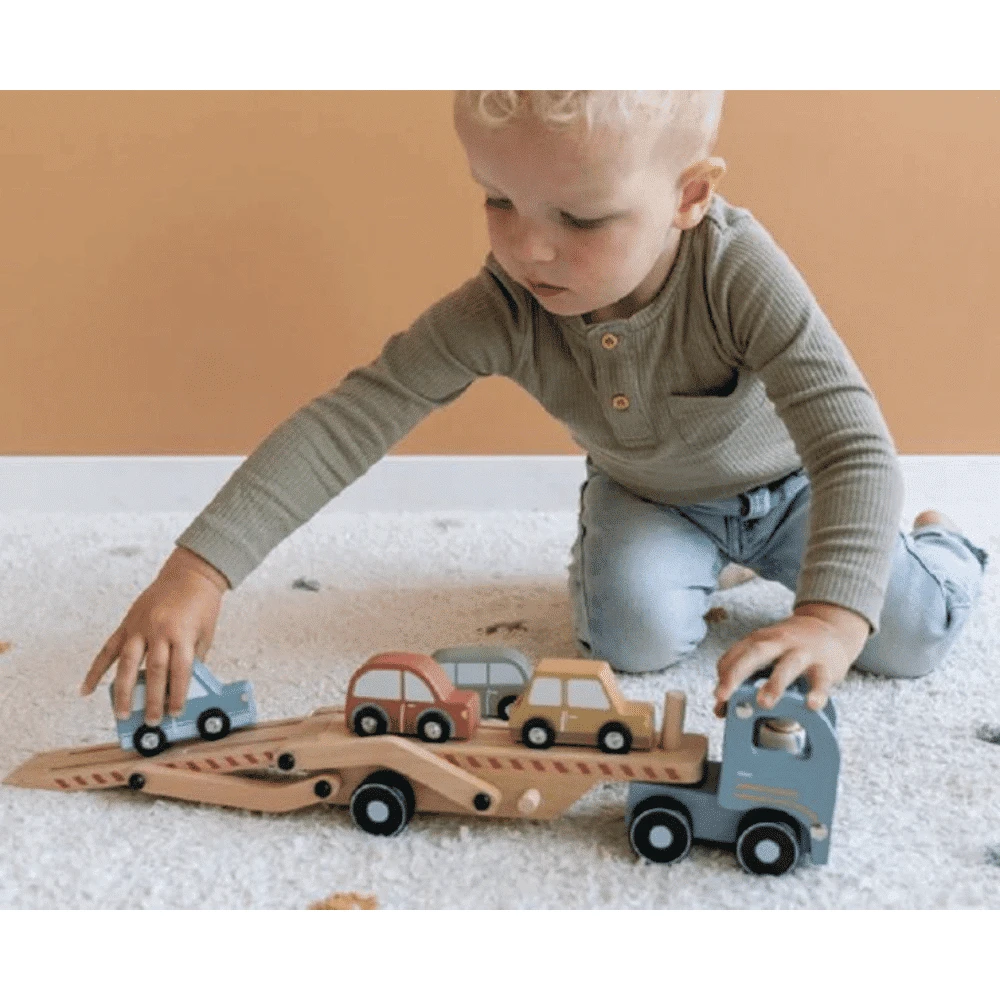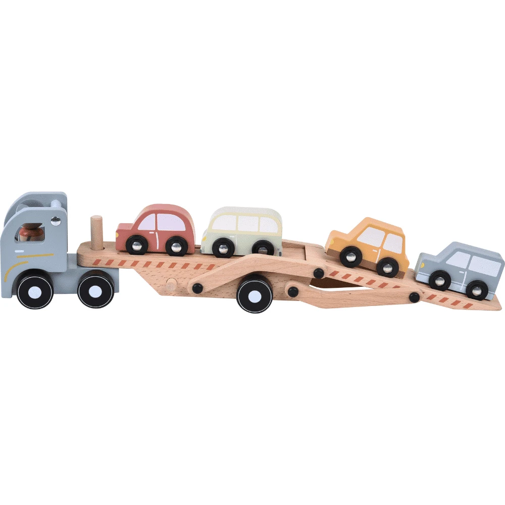 Little Dutch autonkuljetus auto pakkaus sisältää kuljettajan, ison rekan sekä neljä pienempää autoa, joita rekka voi kuljettaa kahdessa kerroksessa lavallaan. Lastausvaunu voidaan laskea alas ja nostaa ylös liikkeelle lähtiessä. Little Dutch -autonkuljetusauton vaunu taittuu kahteen eri tasoon, mahdollistaen puisten pikkuautojen ajamisen suoraan kuljetusauton kyytiin.