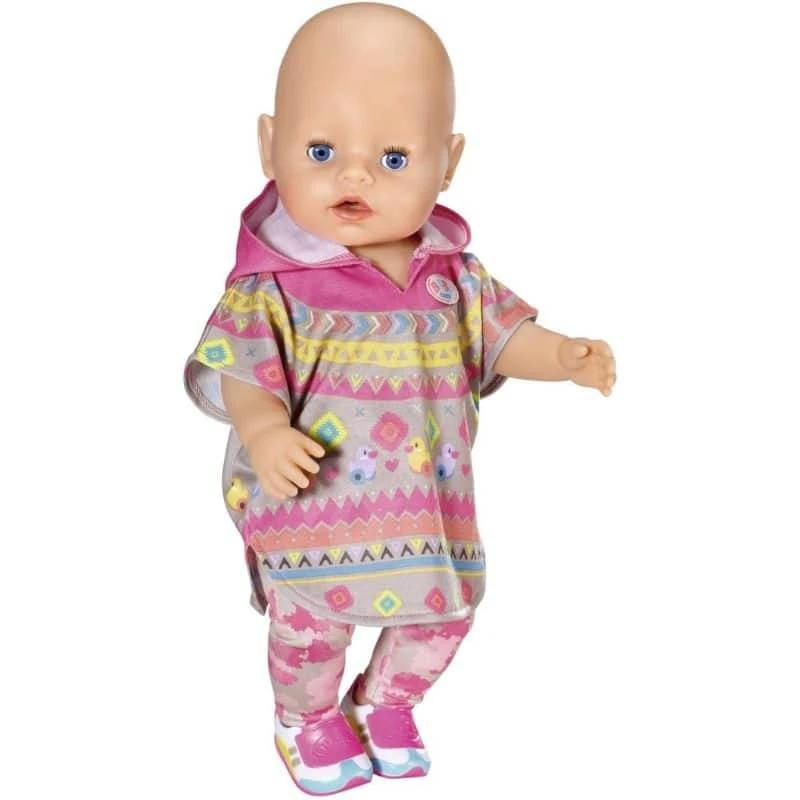 Hauska, kuvioillinen ja yksityiskohtainen asu 43 cm kokoiselle Baby Born nukelle. Tuote sisältää ponchon, trikoot ja kengät nukelle. Hieno lahjaidea!