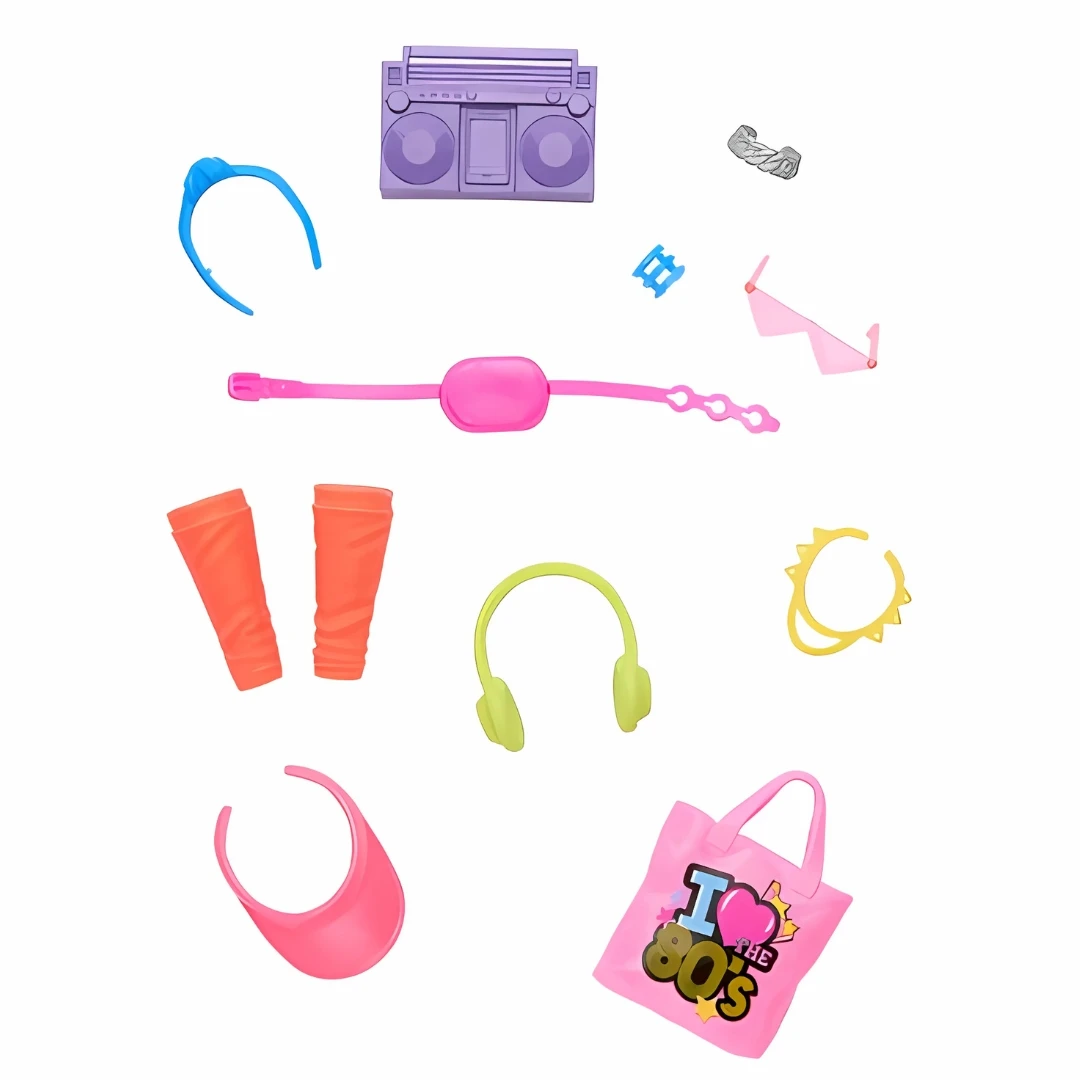 Setistä löytyy kirkkaanvihreät kuulokkeet, jotka tuovat Barbien tyyliin trendikästä asennetta. Mukana on myös pinkki laukku, jossa lukee ”I ❤️ the 80’s” – täydellinen asuste kaikille muodin ystäville. Lisäksi setissä on aurinkolasit, hikinauhat, rannekkeet ja muita pieniä yksityiskohtia, jotka tekevät Barbien lookista ainutlaatuisen ja persoonallisen.