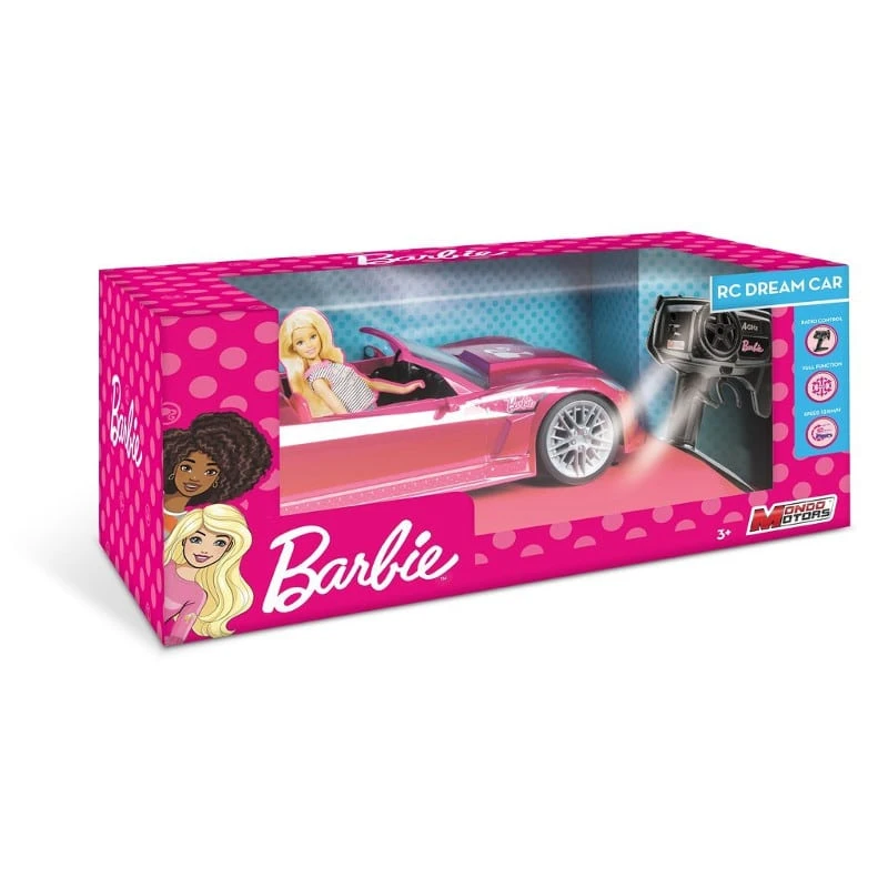 - Barbie-leikit saavat vauhtia uudesta kauko-ohjattavasta autosta. Se on tyylikkään pinkki ja virtaviivainen. Autossa on toimivat ajovalot ja sen pituus on 40 cm. Autoa ohjataan helppokäyttöisellä GHz-ohjaimella. Barbie-nukke ei sisälly pakkaukseen.
