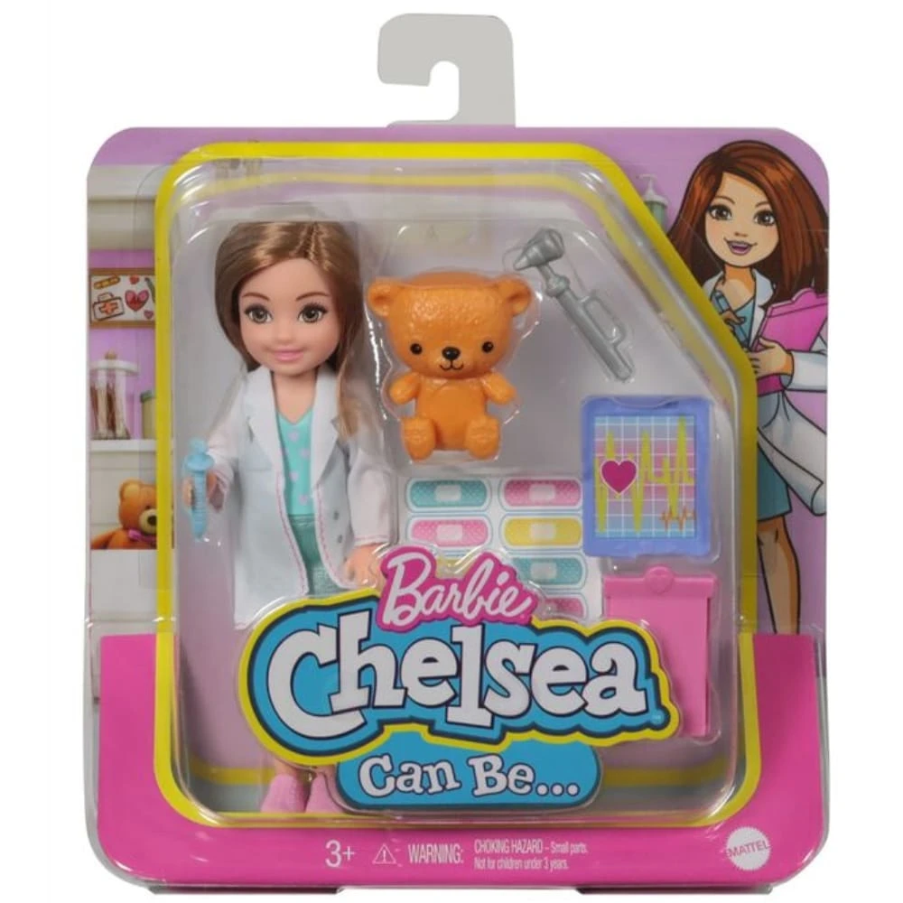 Barbie Chelsea lääkäri – Chelsea tykkää leikkiä erilaisia ammattileikkejä. Nukella on yllään ammattiin sopivat vaatteet ja mukanaan tärkeitä tarvikkeita. Haluaisitko sinä leikkiä tänään lääkäriä? Valikoimassamme on useita erilaisia ammatti aiheisia nukkeja, jotka myydään erikseen. Ikäsuositus: 3+ vuotta.