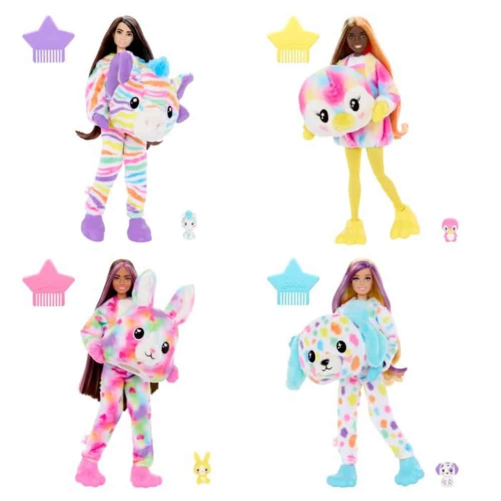 - Barbie cutie rainbow-coloured plush animal costume reveals a Barbie with matching outfit. The package includes a cute mini pet and 10 surprises, including two colour change activations! The doll is articulated. Many to choose from. 3+