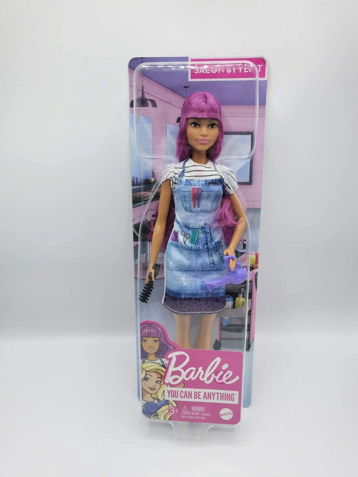 - Tällä liila tukkaisella Barbie nukella voit leikkiä kampaajaa! Barbiella on päällään t-paita, tennarit sekä farkkumekko, jonka taskussa on hiussakset, kampa, hiusklipseja ja muuta tarpeellista.