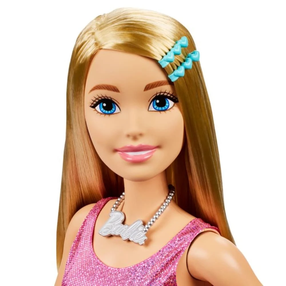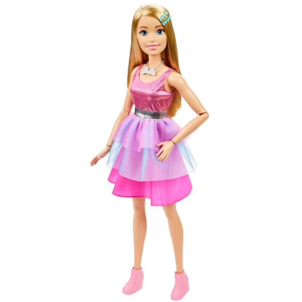 - Make a true Barbie fan happy with this large Barbie doll. The doll is 71 cm tall, and she is wearing a pink tiered dress, silver belt and necklace and hair clips. The doll is articulated. 3+