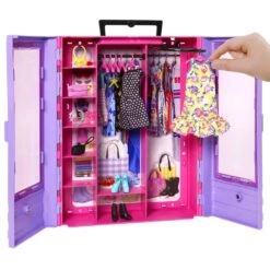 - Bakom dörrarna till den imponerande garderoben finns sex galgar, flera mindre förvaringsutrymmen och ett hopfällbart klädräck. Garderoben rymmer också Barbie, så du kan bekvämt packa en docka och kläder med dig (säljs separat). 3+