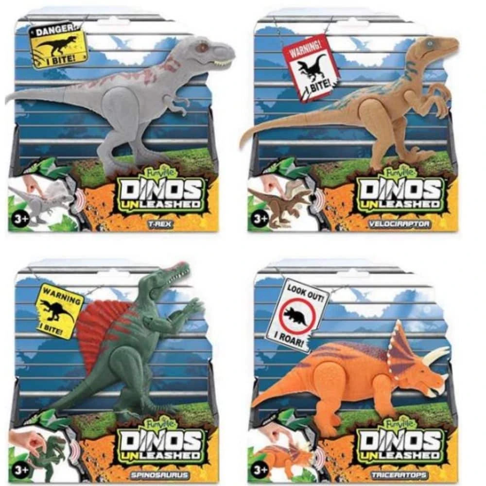 - Lajitelmassa on neljä erilaista: Spinosaurus, T-Rex, Triceratops ja Velociraptor.