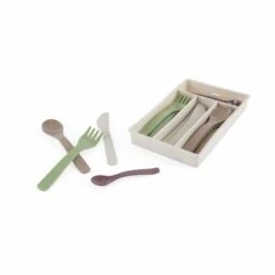 Ekologiset Dantoy-leikkiaterimet sopivat mainiosti keittiöleikkeihin niin sisällä kuin ulkona! Aterinsetti sisältää aterinlaatikon sekä haarukat, veitset, lusikat ja teelusikat neljälle pienelle ruokailijalle. Aterimet on valmistettu elintarvikelaatuisesta muovista, jolloin ne sopivat myös ihan oikeaan ruokailuun. Dantoy Ekologiset leikkiaterimet voidaan pestä tiskikoneessa.