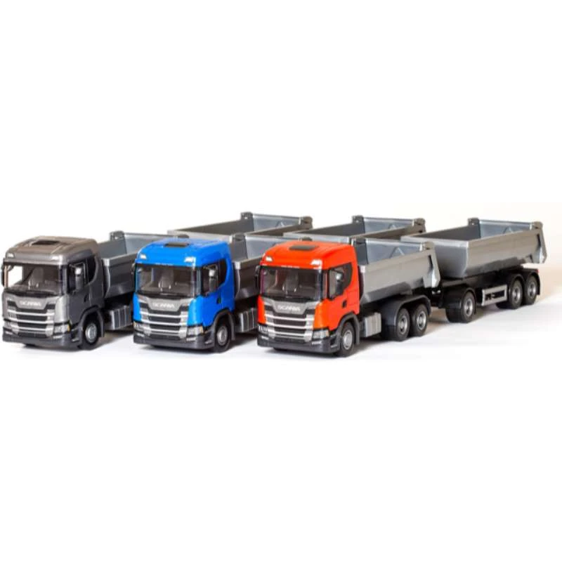 Scania G500 Next Generation Hiekkarekan autossa ja peräkärryssä on kippitoiminto sekä avattava perälauta. Autossa on lisäksi takapyöräjousitus. Värilajitelma. Mukana peilisarja.