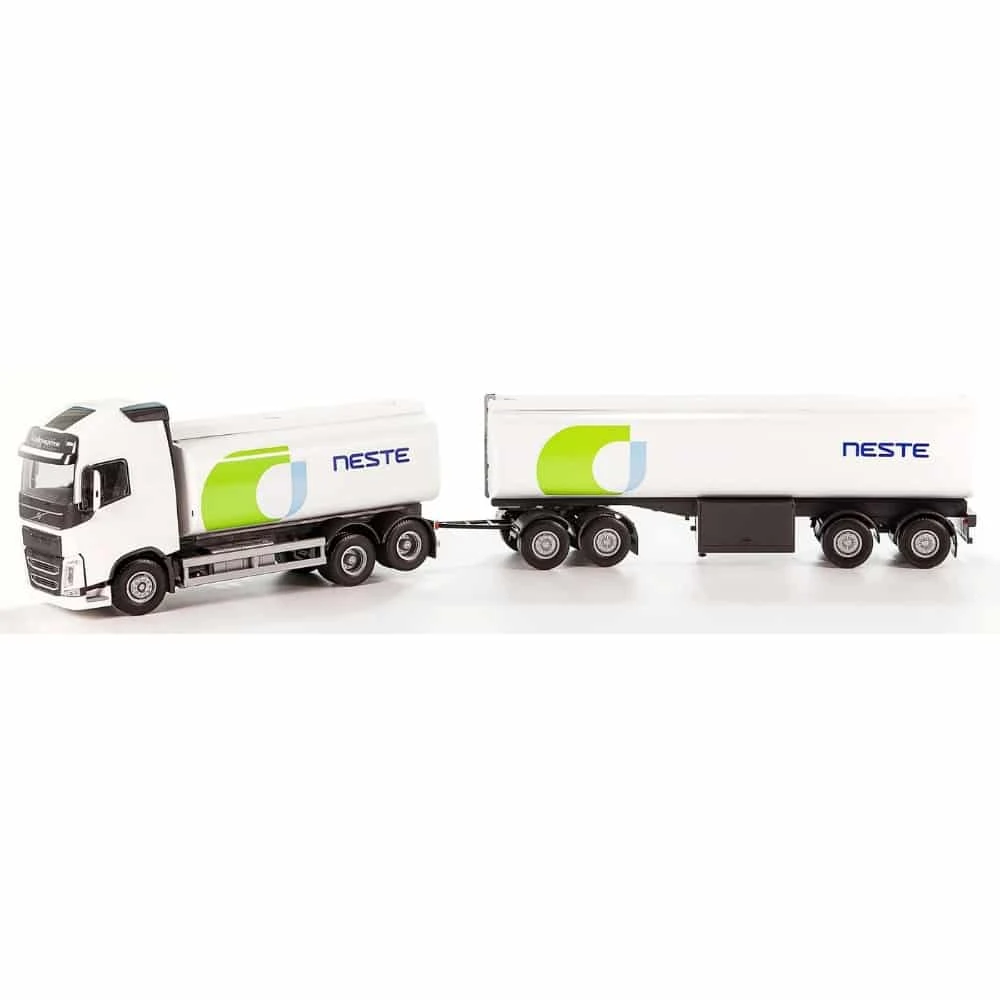 Nesteen täysperä säiliörekan Volvo FH -vetoautossa ja kärryssä on 2 dl vesisäiliöt sekä suljettavat poistoletkut. Rekassa mukana myös upea peilisarja.