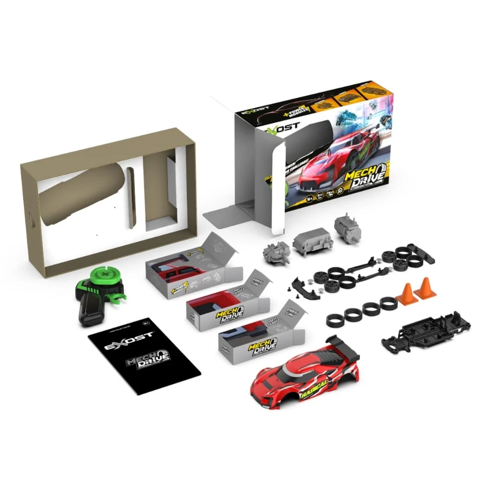 Exost Mech Drive – Radical Racer. Rakenna itse oma kauko-ohjattava kilpa-auto! Pakkauksessa kolme erilaista laatikkoa RC:n kokoamista varten. Avaa laatikot 1 ja 2 löytääksesi kaikki osat, joita tarvitset oman RC-kilpa-ajoneuvosi rakentamiseen. Yli 25 osaa mm. moottorit, ohjaus, pyörät, renkaat jne.