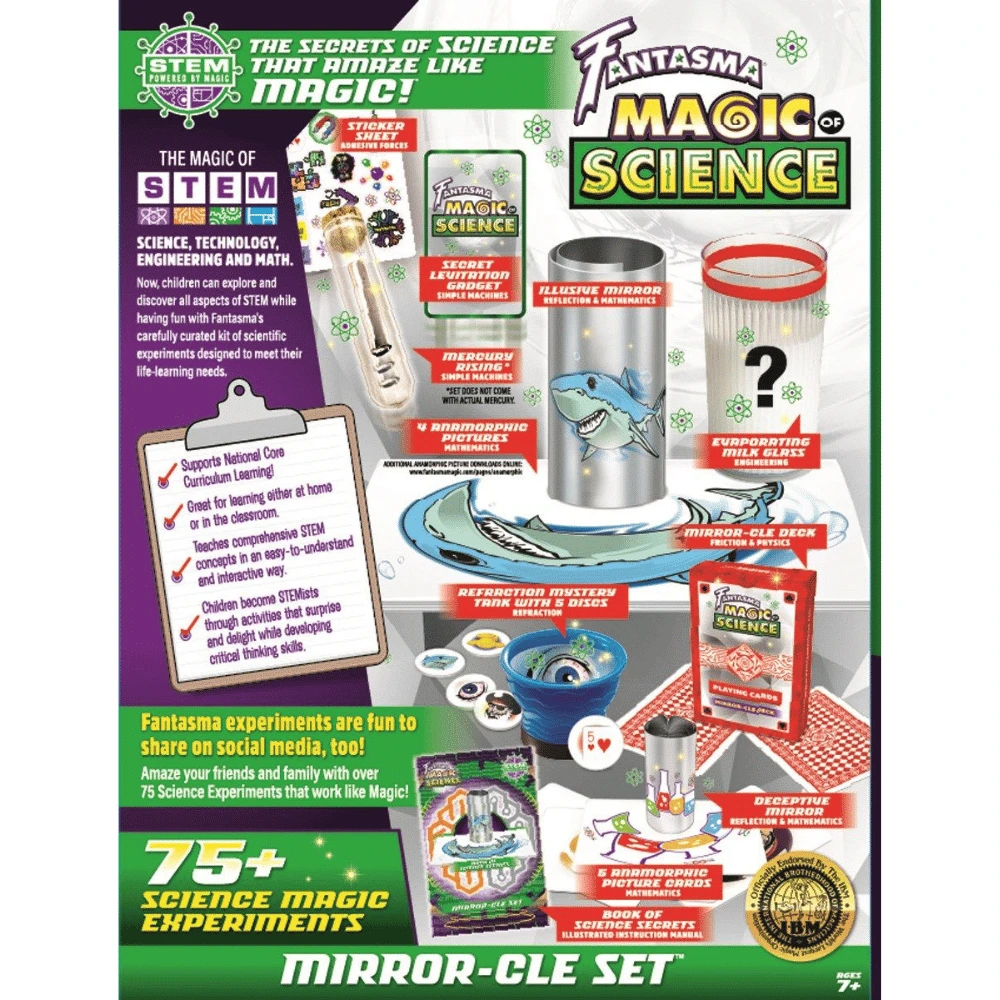 Fantasma magic Mirror-Cle-setti auttaa sinua kehittämään itseluottamustasi, esiintymistä, käsien ja silmän koordinaatiota ja ihmisten välistä kommunikaatiota. Täydellinen lahja yli 7-vuotiaille pojille ja tytöille. Fantasma-taikasetit ovat ainoita taikasettejä, jotka International Brotherhood of Magiciansin ammattilaiset ovat hyväksyneet. STEM taikasetissä on yli 75 hämmästyttävän maagista tiedekoetta.