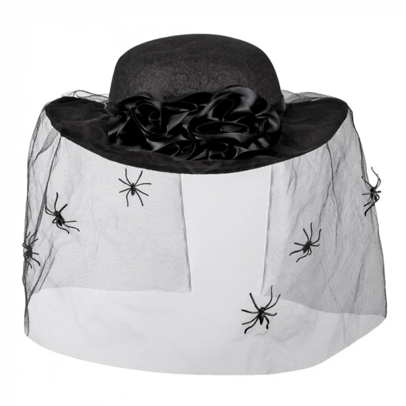 - Täydennä halloween-asuasi mustana leskenä tällä mustalla hunnulla varustetulla hatulla. Hunnussa on hämähäkkejä, mikä antaa hatulle kammottavan ilmeen. Koko sopii aikuisille ja lapsille.