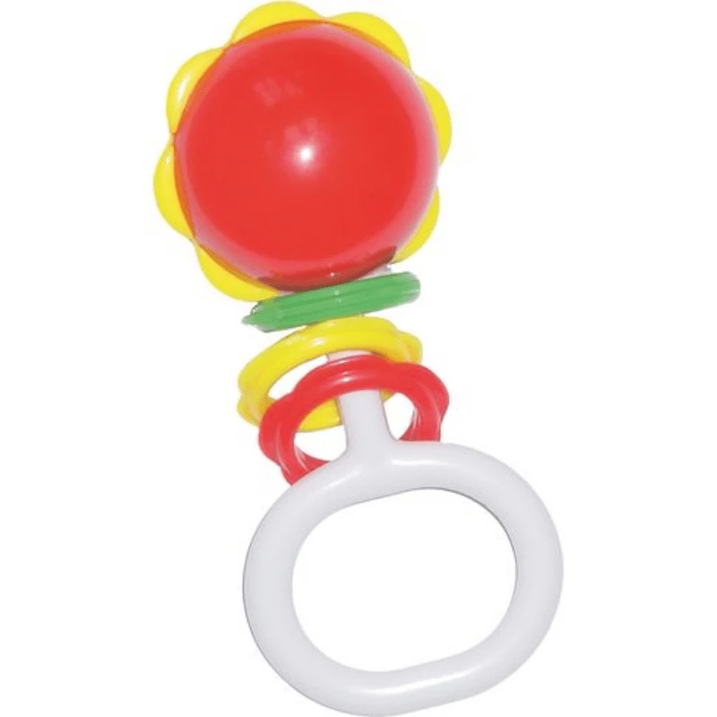Hauska helposti tartuttava kukan muotoinen helistin. Helistimen varressa on värikkäät renkaat, joita on kiva tutkia.