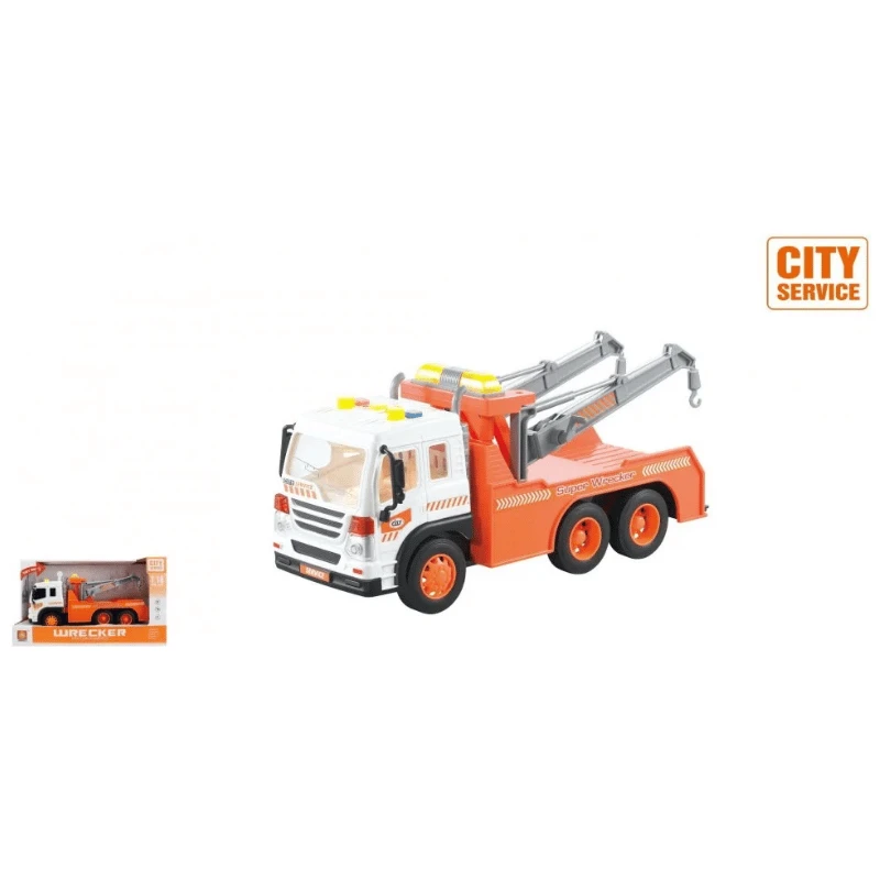 Oranssi hinausauto jossa on valo- ja äänieffektit. Lisäksi siinä on myös vauhtipyörämekanismi ja puominosturi, jonka avulla autot saadaan hinattua lavalle.