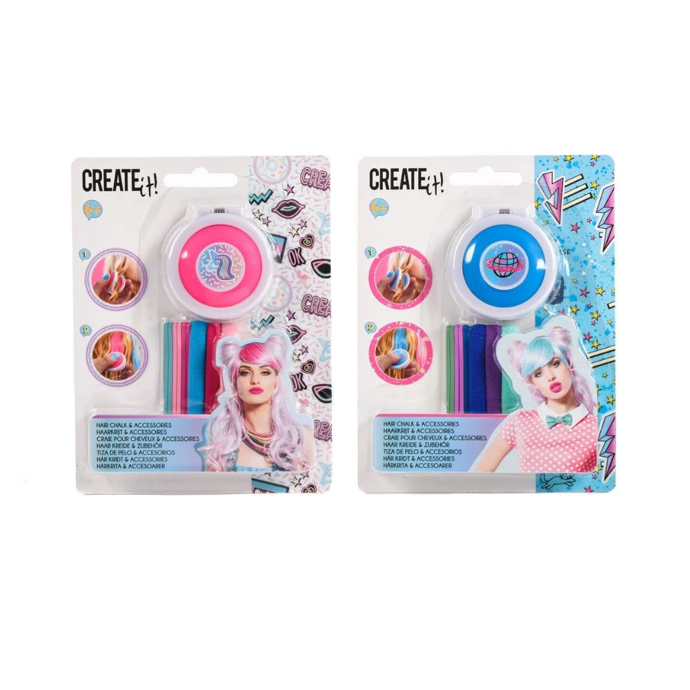 CREATE IT! Hairchalk -hiusväriliidut ovat suunniteltu tarjoamaan väliaikaista väriä hiuksiin helposti ja nopeasti. Pakkauksessa on kaksi erilaista settiä, jotka sisältävät useita värivaihtoehtoja sekä hiustarvikkeita, kuten hiuslenkkejä ja -klipsejä, jotka auttavat luomaan monipuolisia kampauksia. Hiusväriliidut ovat turvallisia käyttää, ja väri on helppo pestä pois shampoolla. Ne sopivat erityisesti tilapäisiin tyyleihin, juhliin tai muihin erityistilaisuuksiin, joissa halutaan lisätä hiuksiin hetkellistä väriä ilman pysyvää sitoutumista.