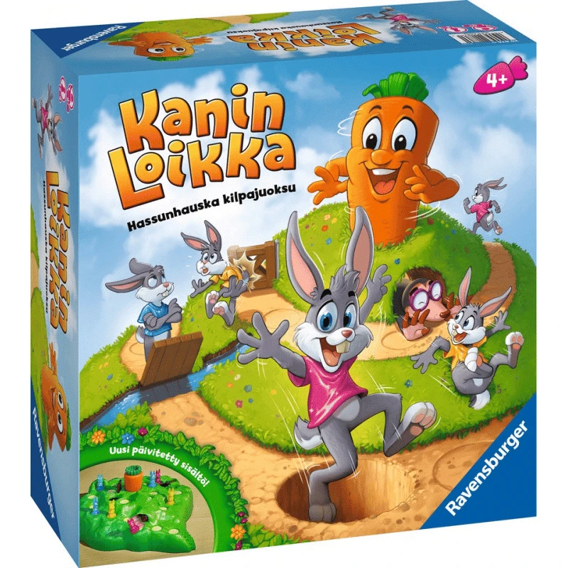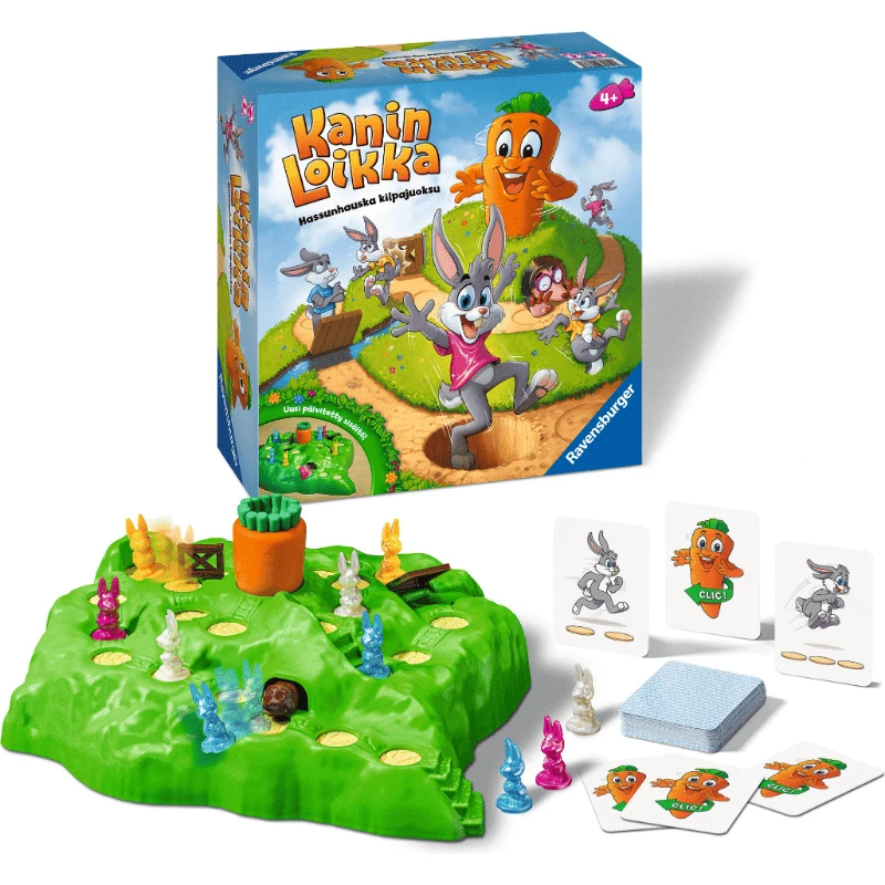 Pakkaus sisältää: 1 pelilauta, jossa liikkuvat reiät, myyrä, silta, aita ja kierrettävä porkkana, 16 kania, 48 pelikorttia, 1 ohje