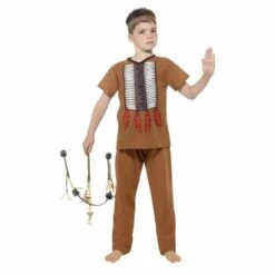 Lasten intiaanipoika-naamiaisasu. Pakkaus sisältää ruskean paidan ja housut, sekä hiuspannan. Paidan etupuolella iso sulkapainatus.
