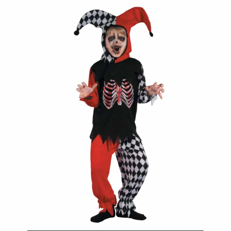 Lasten mustapunavalkoiseen kauhu Harlequin -pukuun kuuluu housut, yläosa ja huppupäähine. Toinen puoli asua on punainen ja toinen mustavalkoruudullinen. Harlequinin paidassa on luurankopainatus ja se on tahrittu tekoverellä. Harlequin tupsuhattu kiinnitetään kaulan alta tarralla.