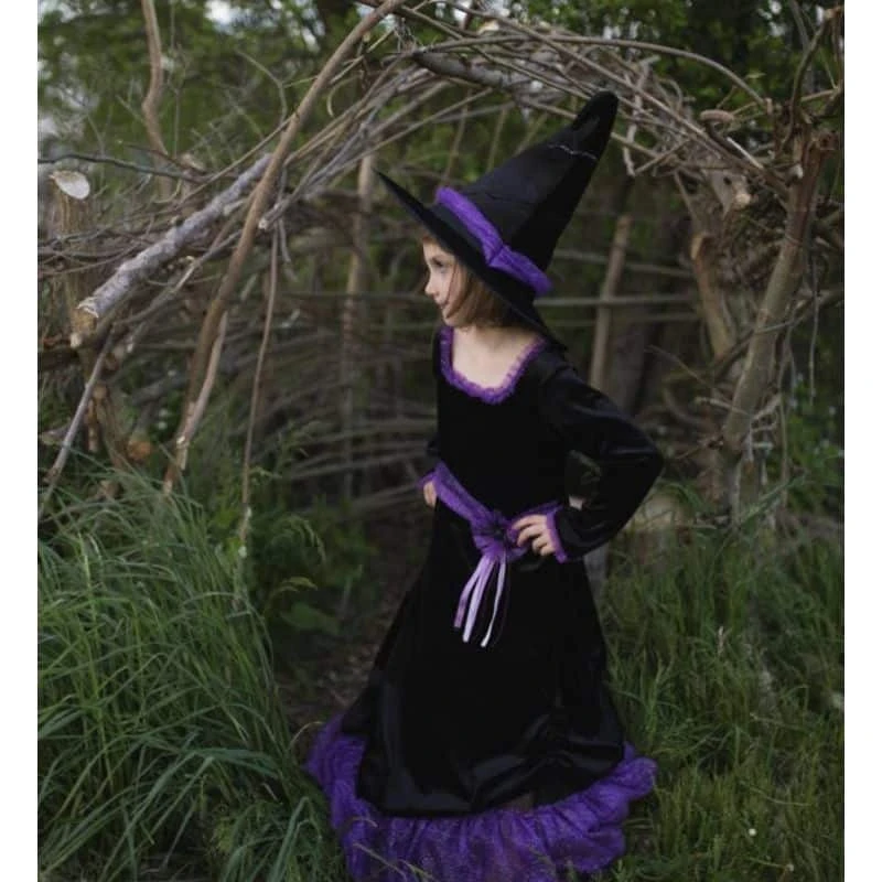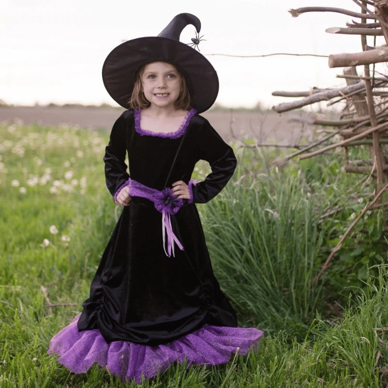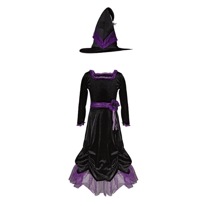 Upea ja tyylikäs musta-liila noitamekko ja -hattu! Noitamekon kyse on sametista. Mekko on valmistettu upeasta pehmeästä mustasta sametista ja koristeltu violetilla aksentilla. Kaunis violetti glitter -tylli koristaa vyötäröä, pääntietä, hihoja ja röyhelöä pohjassa. Mekko sisältää vanteen täyteyttä varten ja mustan samettisen hameen verhot vanteen päällä. Lantiolla vyötäröllä on musta kimalteleva hämähäkki, ja myös musta kimalteleva hämähäkki roikkuu hatun kaarella!