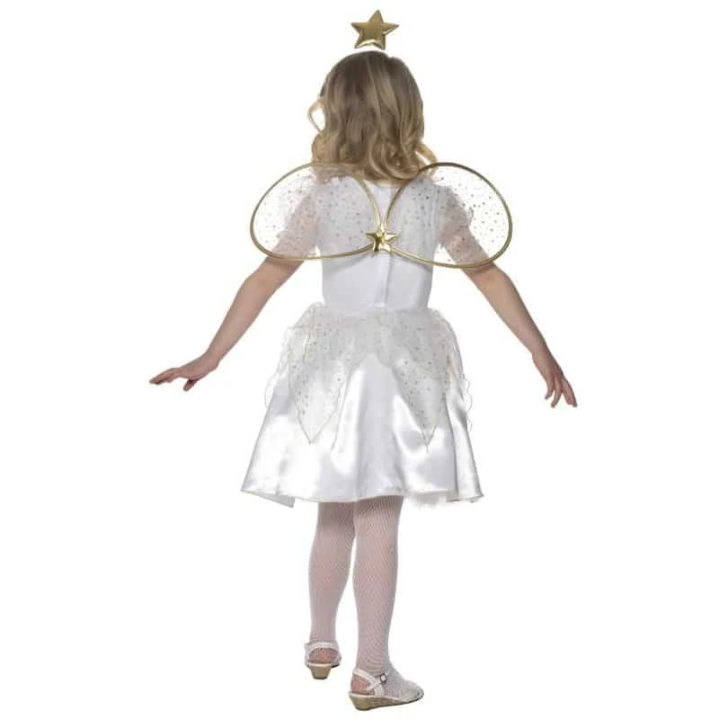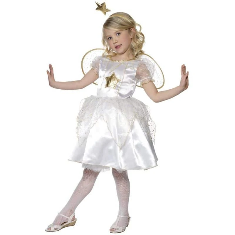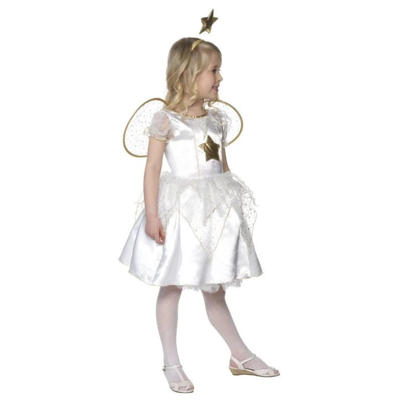 - Valkoinen satiinimekko, tyllihihat ja helmaosassa kaksi eri pituista tyllikerrosta. Kullanväriset kanttaukset ja koristelut. Tyllikankaiset siivet, tarranauha kiinnitys selkäpuolelle. Kultainen hiuspanta tähtikoristeella.
