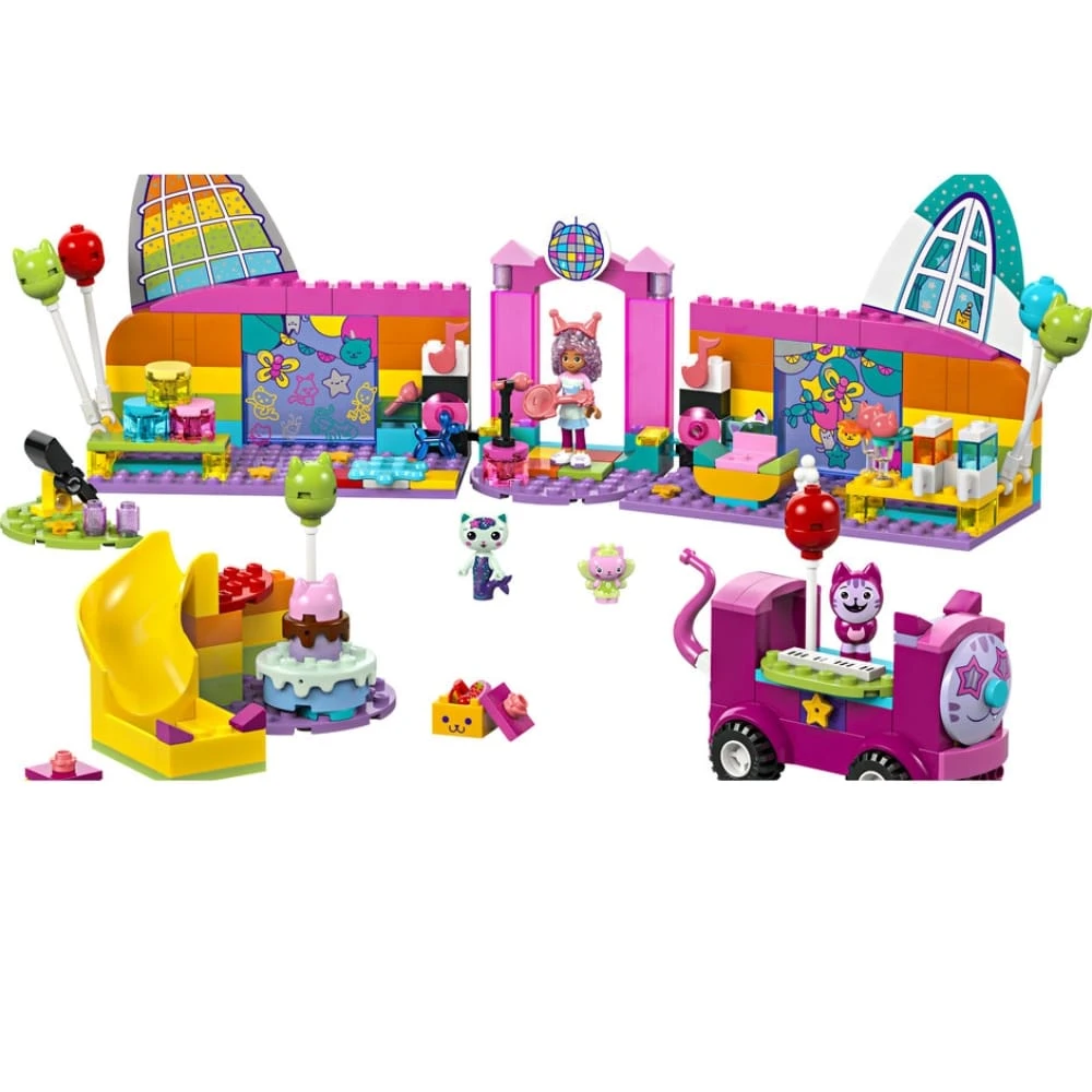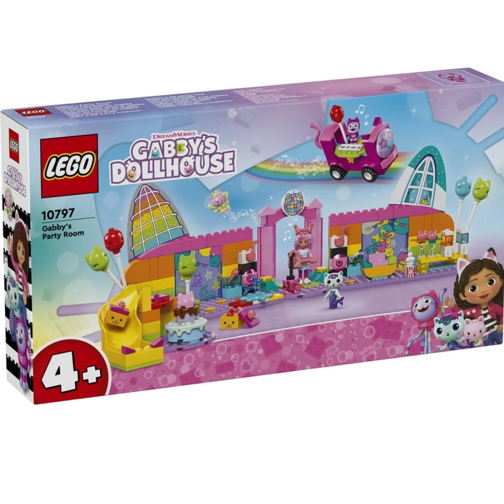 Tytöille ja pojille sopivassa Lego Gabby’s Dollhouse 10797 bilehuone lelusetissä järjestetään hauskat diskobileet ja paljon muuta! Setissä on Gabbyn, Daniel Jamesin eli DJ Nauskiksen, Kisukeijun, Merikatin hahmot ja monia musiikkiaiheisia. Juhliin sopivia leluja, kuten työnnettävä bilebussi, jossa on sisäänrakennetut kosketinsoittimet, pyörivä tanssilattia, kitara, 2 mikrofonia ja kimaltava diskopallo. Loputtomien mielikuvitusleikkien näyttämö on siis valmiina! Tarvikkeina on esimerkiksi ilmapalloja ja rullaluistimet rullaluistindiskoon, popcornia ja 2 lasillista jäähilejuomaa juttelunurkassa sekä katapultti ja tölkit kaatamispeliin. Gabbylle on kakku ja lahjapaketteja, jotka toimitetaan liukumäkeä alas. Setissä on iso aloituspalikka, joka auttaa lapsia pääsemään vauhtiin rakentelussa. Rakentamisessa auttaa värikäs ja kuvallinen rakennusohje.