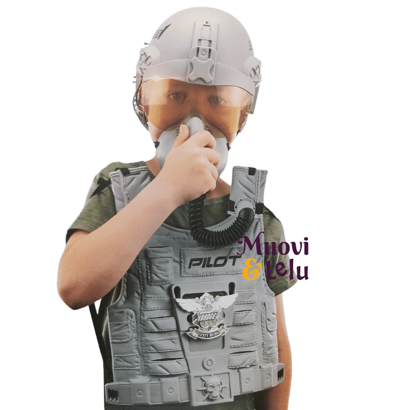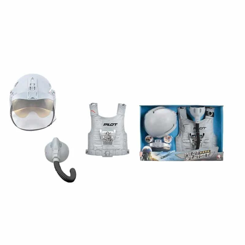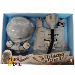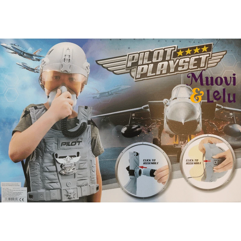 - Setti sisältää säädettävän lentäjänkypärän, -liivin, jossa on hieno lentäjänmerkki, ja happinaamarin.