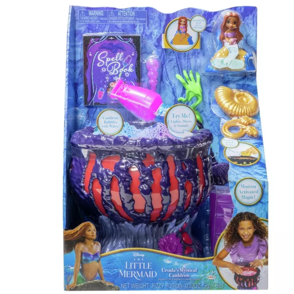 Little Mermaid Ursulan -taikapata – Disney Little Mermaid elokuvasta tuttu Ursulan kupliva taikapata valolla ja äänellä on huikea lahjaidea Little Mermaid-faneille. Mukana tulee Ursulan simpukkakaulakoru, väriä vaihtava Ariel figuuri, kaksi juomapulloa, kaksi poretablettia, loitsukirja, sauva, tiputin ja suppilo.