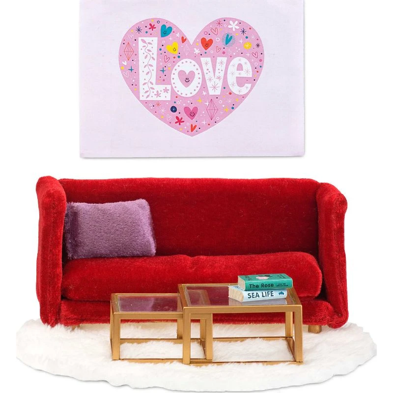 Trendikäs nukkekodin sohva punaista samettia, kullanvärinen sarjapöytä ja pyöreä valkoinen matto. Mukana lisäksi Love-seinätaulu, kirjat ja tyyny.