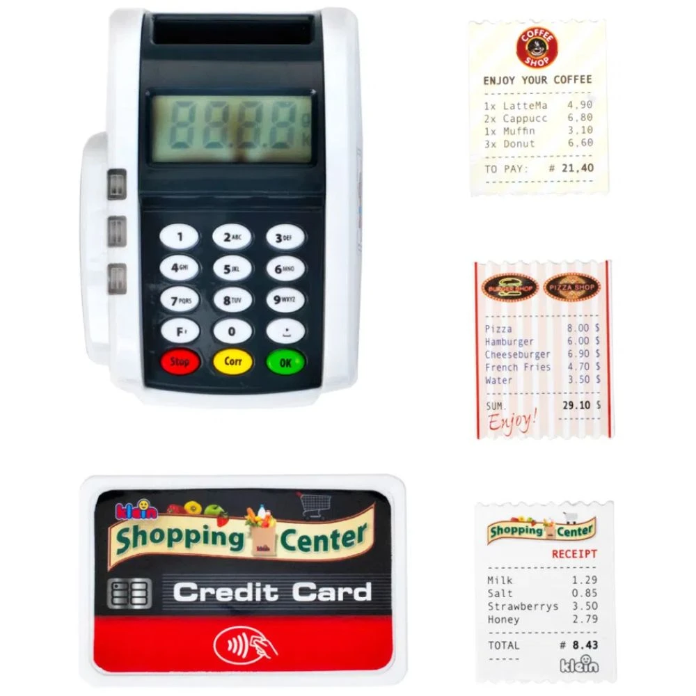 Maksupääte leikkisetti, jolla tuot kauppaleikit kotiisi. Maksu suoritetaan luottokortilla, josta kuuluu oikeita ostosääniä, kun se työnnetään päätteeseen, tai – ilman vetämistä tai koskemista – lähimaksutoiminnolla: Syötä vain summa, vahvista, pidä luottokorttia päätteen sivulla, syötä PIN-koodi, vahvista ja maksu onnistuu. Näin jää enemmän aikaa ystävällisille asiakaskeskusteluille säästä, tuotteista ja hyvinvoinnista, mikä puolestaan harjoittaa pienten kassan käsittelijöiden mielikuvitusta ja kommunikointitaitoja.