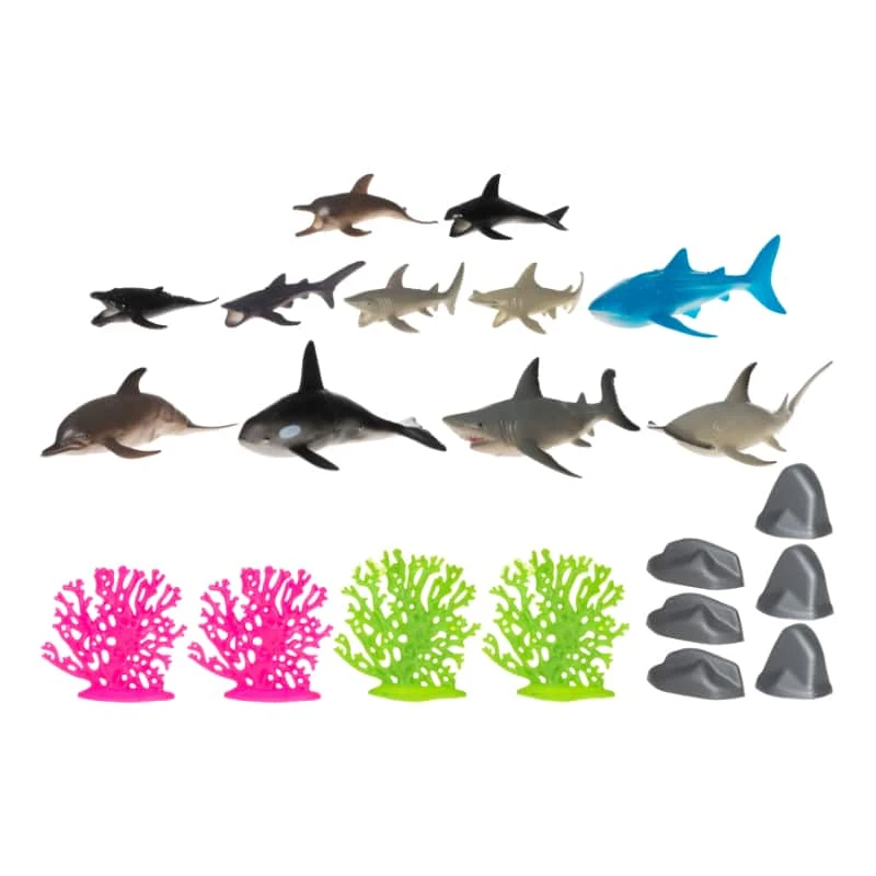 - Pakkauksesta löytyy mm. erilaisia kaloja, hai, delfiini, kiviä ja kasveja.