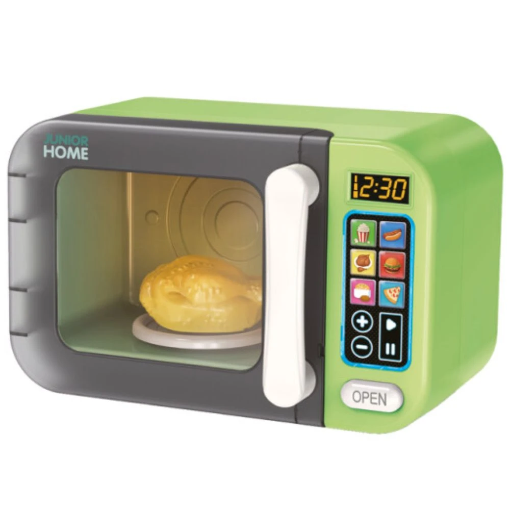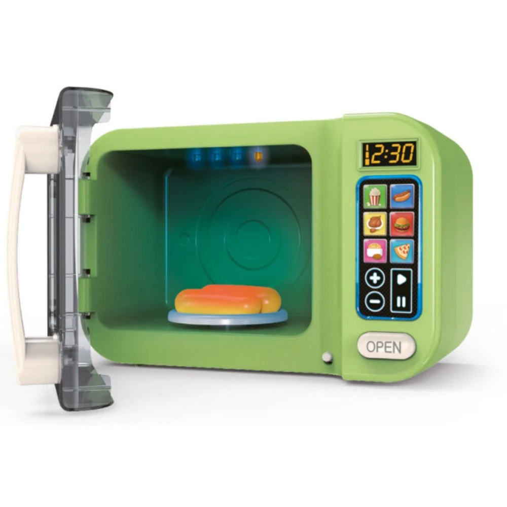 Mikroaaltouuni leikkisetti. Hauskat painikkeet, ajastintoiminto, ääni- ja valotoiminto ja väriä vaihtava leikkiruoka.