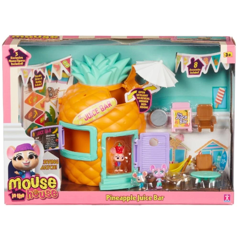 - Tässä siistissä mehubaarissa on avattava kattoluukku makuuhuoneeseen. Mousevillen älykkäät hiiret ovat tehneet ananaksesta hienon rantatyylisen mehubaarin. Mehubaari on täynnä hauskoja ominaisuuksia. Avaa luukku nähdäksesi makuuhuoneen sisällä. Baarissa on avattava ovi ja tarjoiluluukku sekä hauskoja huonekaluja. Mukana tulevilla viireillä voi yhdistää tämän leikkisetin muihin Mouse in the house-leikkisetteihin. Kun valot sammuvat yöllä, Mousevillen tarrat hehkuvat upeasti pimeässä.