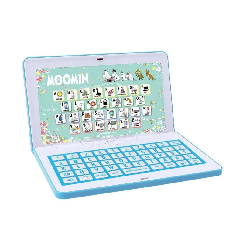 Hauska Muumi-aiheinen läppäri opettaa lapselle numeroita ja kirjaimia sekä sanoja ja tavaamista. Iloinen musiikki viihdyttää leikkivää lasta.