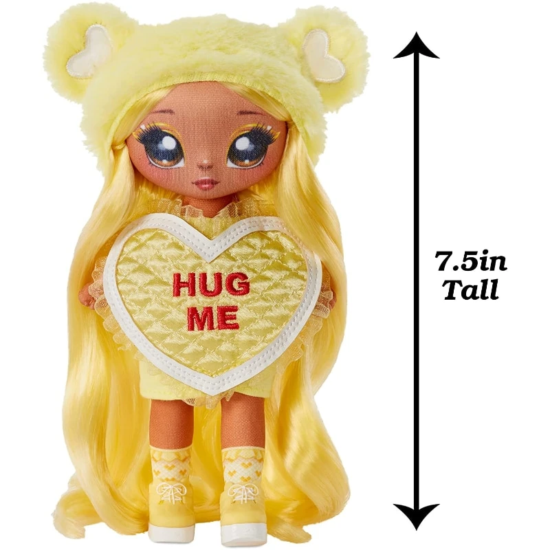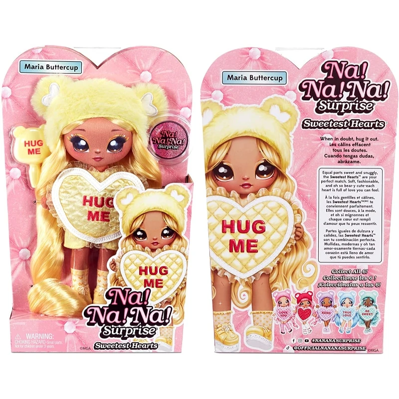 - Kauniilla Maria Buttercup-muotinukella on kaikki vaaleankeltaista! Keltaiset upeat yli maahan ulottuvat aaltoilevat hiukset, suuret maalatut silmät ja päässään suloinen nalle vaikutteinen pörröpipo. Nukella on yllään ”hug me”-tekstillä koristeltu sydänröyhelöpaita ja jaloissaan keltaiset kengät. Kampaa nuken pitkiä hiuksia mukana tulevalla kammalla. Nukella on pehmeä kankainen pää ja vartalo. Sen pipo ei ole irrotettavissa. Upea lahjaidea!
