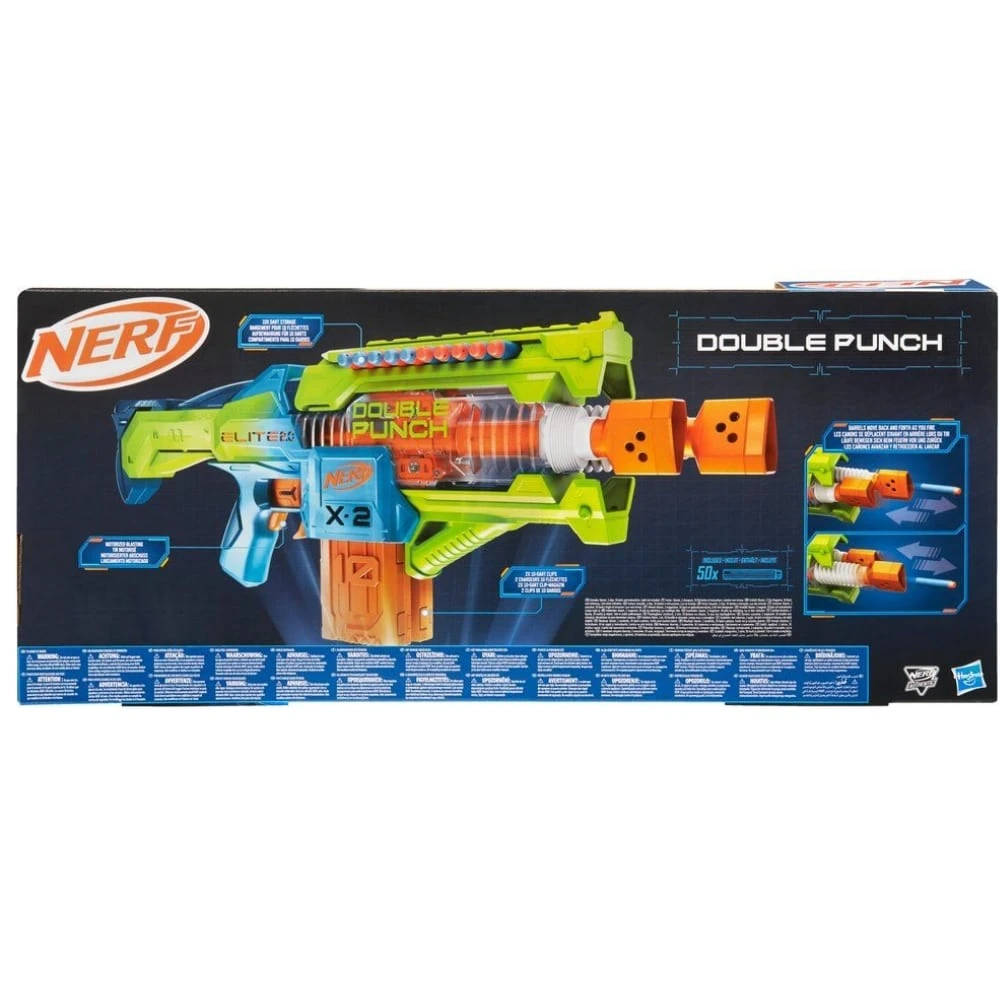 - In english: The Nerf Elite 2.0 Douplepunch is a motorized toy gun that includes 2 barrels that move back and forth when fired. Nerf gun games are a fun and exercise activity. The package contains 50 ammo and two 10 ammo magazines. Batteries 4 x AA sold separately. Age rating: 8+ years.