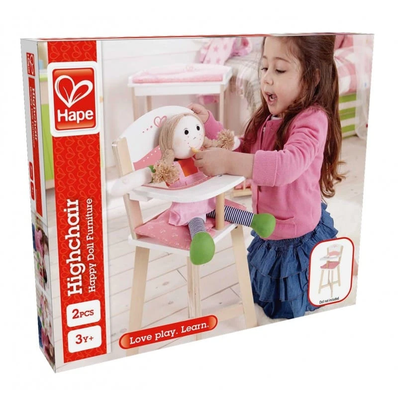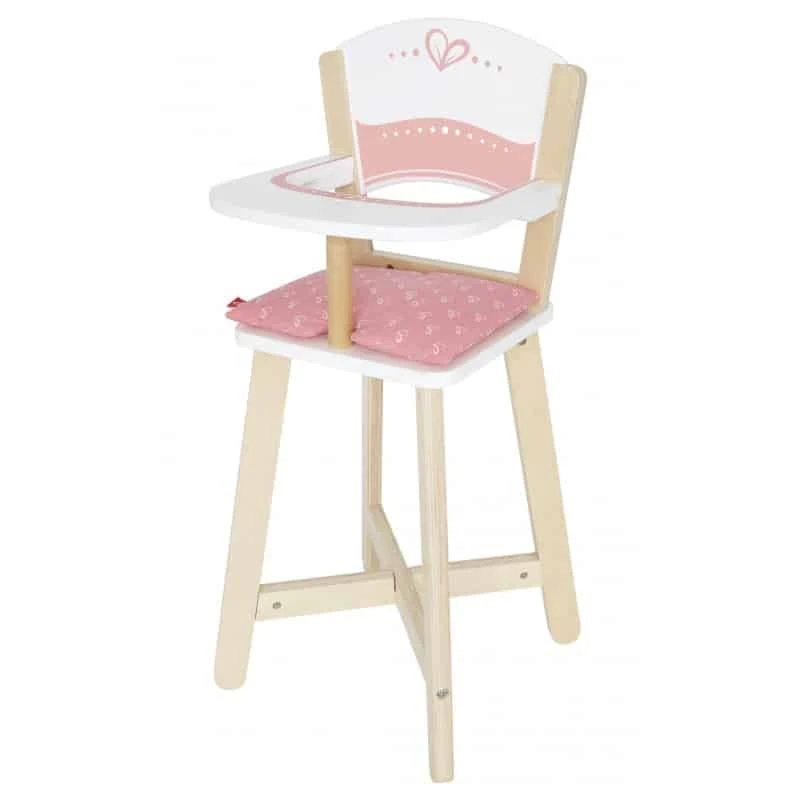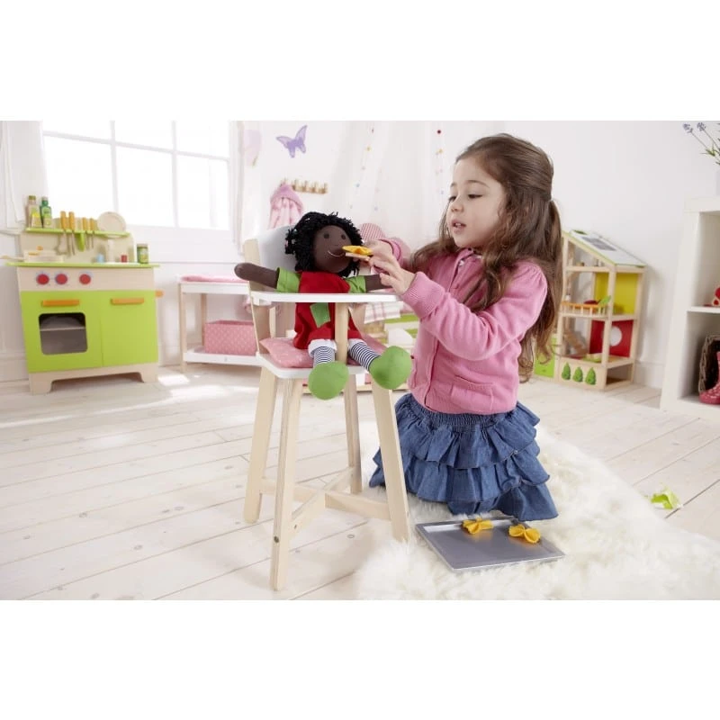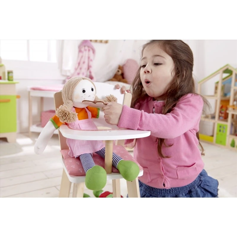 Korkea pieni syöttötuoli tukee nukkeja istumaan suorassa ja syömään ruokansa.