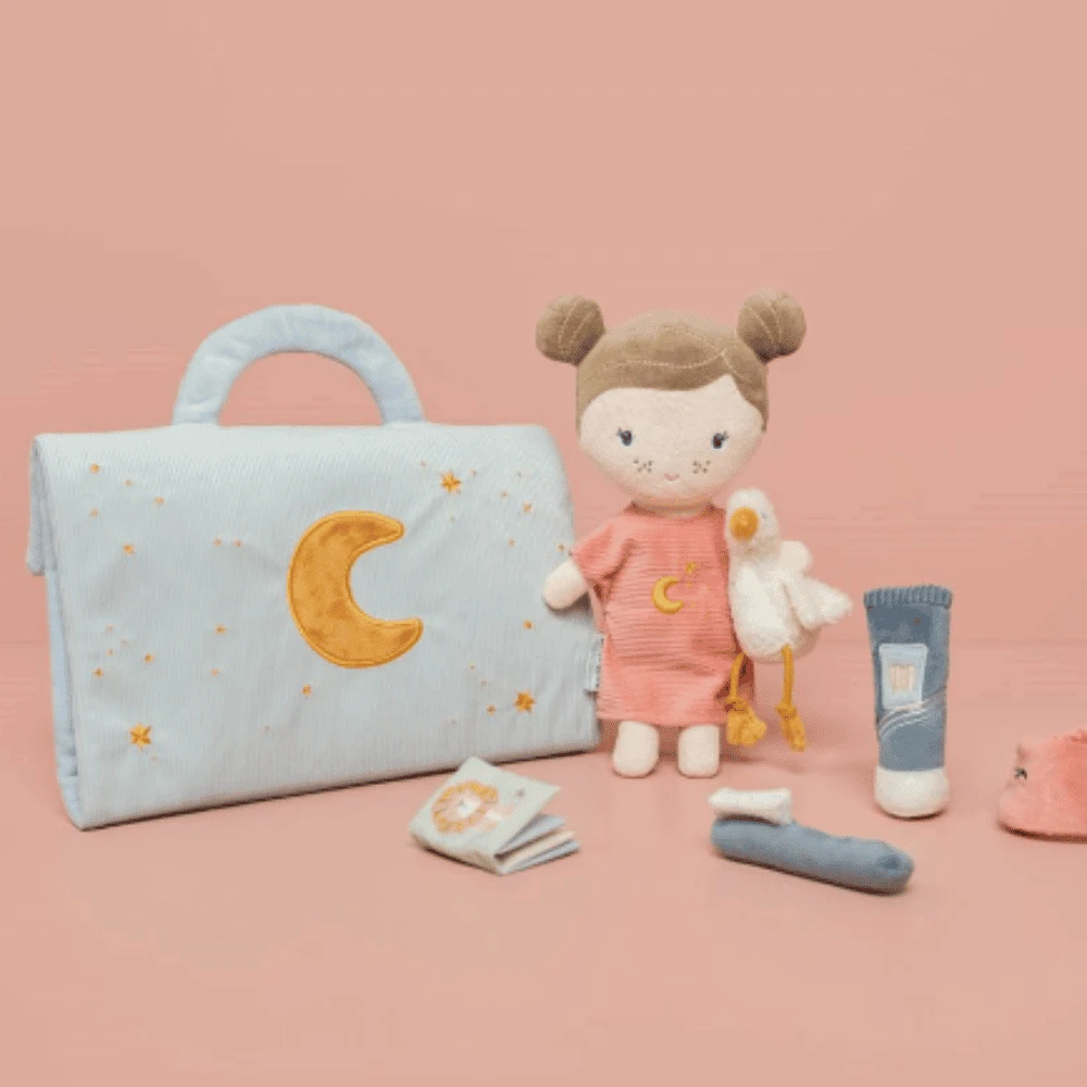 Nukke leikkisetti yökylässä Little Dutch On nukkumisen aika! Roosa ei yksinkertaisesti malta odottaa. Hän on pakannut matkalaukkunsa kaikki olennaiset tavarat yöksi. Tietysti hänen suosikki pehmolelu on mukana hänen kanssaan. Missä haluaisit yöpyä yhdessä? Huoneessasi vai suunnitteletko vierailua isovanhempasi luo? Minne ikinä menetkin, Rosa on siellä halailemaan ja leikkimään.