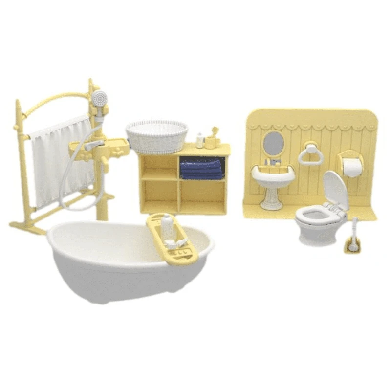 Kylpyhuoneessa/ vessassa pestään päivittäin hampaat, käydään kylvyssä, pestään käsiä ja sitä pidetään siistinä. Sisusta nukkekotisi kylpyhuone tällä kauniilla maalaisromanttisella setillä! Pakkaus sisältää nukkekotiin sopivan wc-pöntön, ammeen, suihkun, lavuaarin, lipaston, pyyhkeet ja muita tarpeellisia kylpyhuonetarvikkeita.