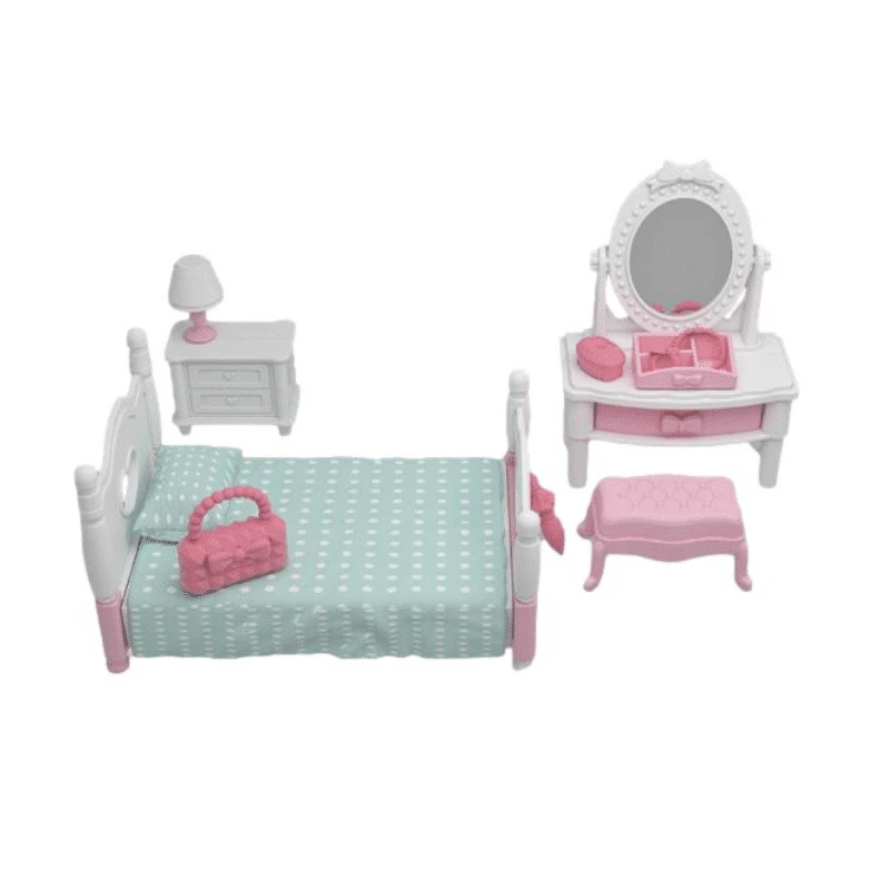 Kaunis makuuhuoneen kalustus nukkekotiin. Pakkauksessa on peilipöytä ja siihen kuuluva tuoli, sänky, yöpöytä ja runsaasti pieniä tarvikkeita sekä vuodevaatteet.