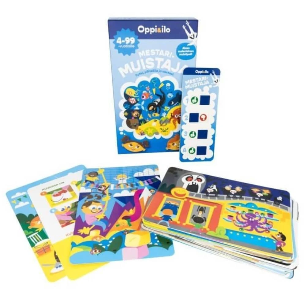 Vauhdikas ja hauska Oppi&ilo Mestarimuistaja -lautapeli tempaa mukaansa niin lapset kuin aikuisetkin. Upean värikkäät ja humoristisen hauskat kuvamaailmat kiehtovat ja kutsuvat pelaamaan uudelleen ja uudelleen! Pelissä on 40 kappaletta A5-kokoisia kuva- ja väittämäkortteja. Kuvituksessa seikkaillaan mm. viidakossa, kauppatorilla, lentokentällä, ötököiden maailmassa, huvipuistossa, museossa, urheilukilpailussa, aavikolla, Suomen Lapissa jne. Mitä näit? Paina yksityiskohdat mieleesi ja voit olla Mestarimuistaja!