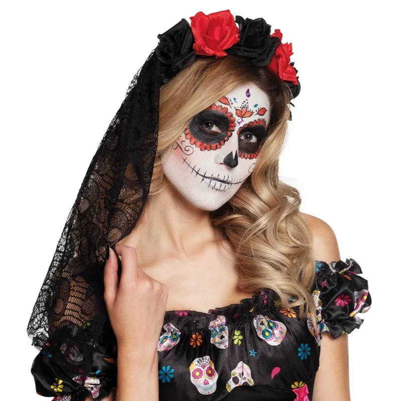 La Rosa panta, jossa on mustia ja punaisia kukkia ja huntu sopii naamiaisiin, Halloweeniin ja roolileikkeihin. Koko sopii aikuisille ja lapsille.