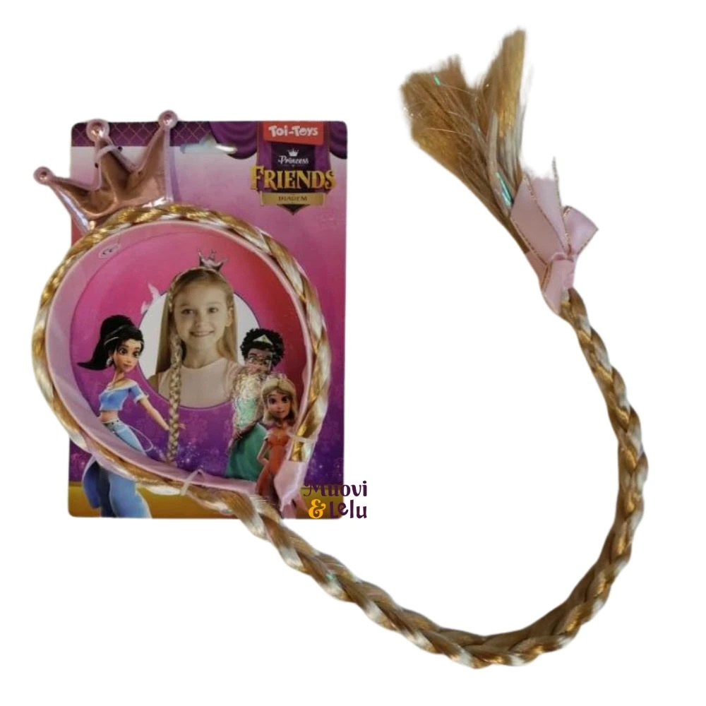 Muuntaudu hetkessä satuprinsessaksi! Ihanan kiiltavä palmikko kiertää pannan yli ja jatkuu pitkänä palmikkona. Pannassa päällä kiiltävä vaaleanpunainen kruunu.