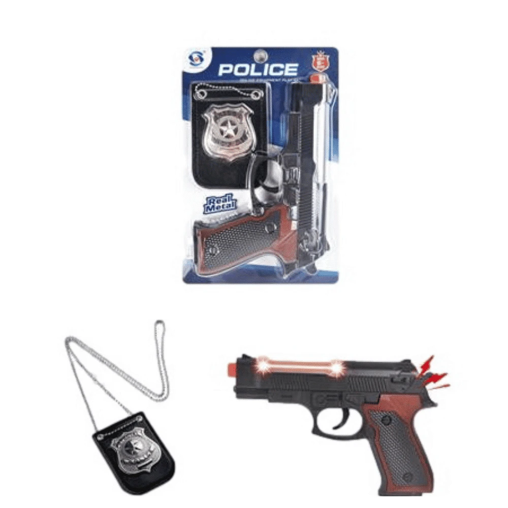 Leikkipyssy ja virkamerkki ääni- ja valotehostein sopii jokaiselle pikkupoliisille. Setin mukana myös tulee leikkipyssy ja virkamerkki. Tällä setillä voit ottaa pahimmatkin roistot kiinni. Ei muuta kuin pyssy taskuun, virkamerkki mukaan ja partioimaan.