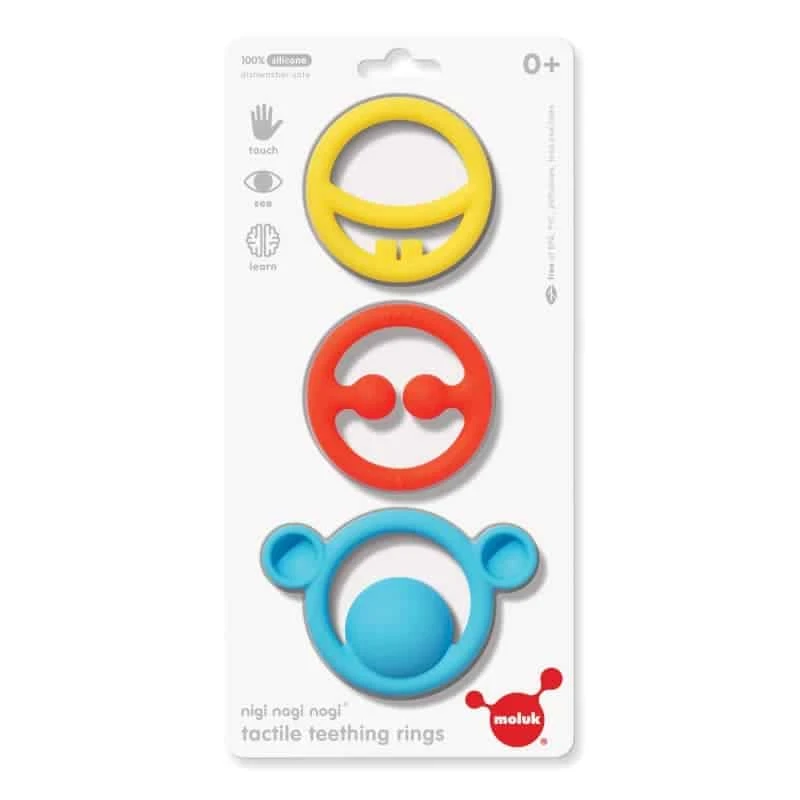 Nigi Nagi Nogi rauhoittaa vauvan kipeitä ikeniä silmänräpäyksessä. Valmistettu 100% elintarvikekäyttöisestä silikonista, MOLUKin uusiin “hammasrenkaisiin” pienokaisen on helppo tarttua ja pitää niistä kiinni. Ne stimuloivat myös pienokaisen aisteja (kosketus ja näkö).