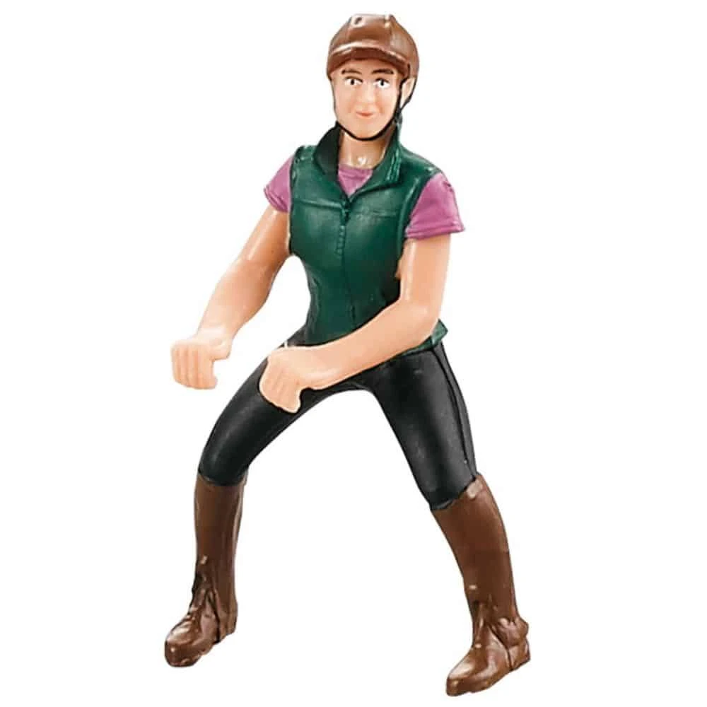 Ratsastaja pienille leikkihevosille. Tyttö, asusteena tummanvihreä liivi, mustat housut.