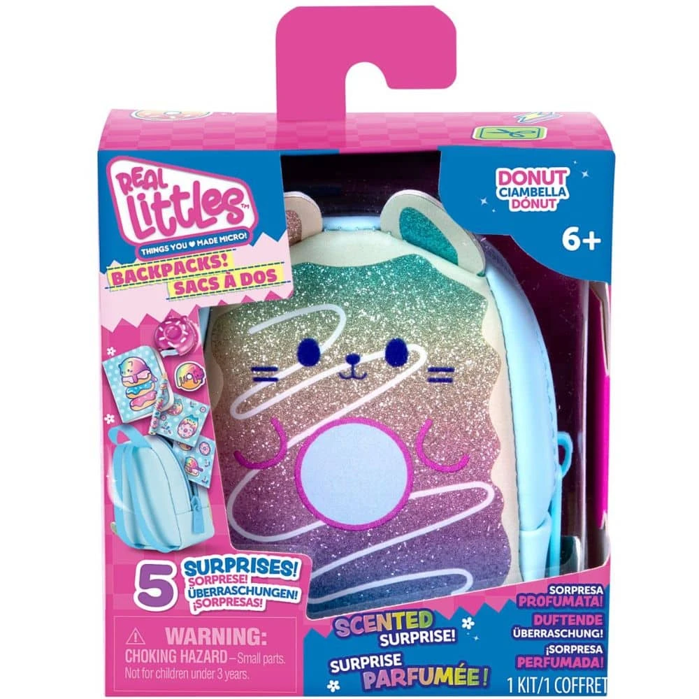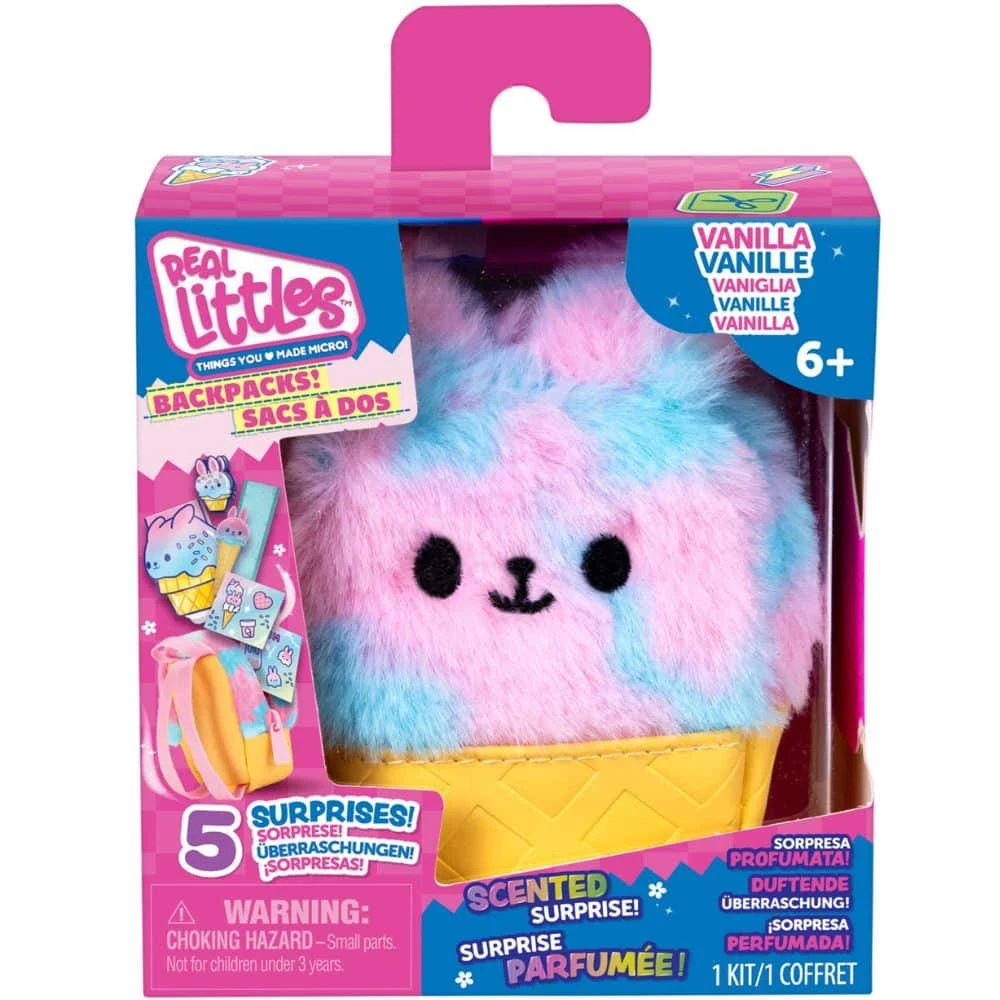 Real Littles – tuoksuva minikokoinen yllätysreppu. Pehmeä, pörröinen, söpö, ruoka- ja eläinaiheinen minikokoinen reppu, jonka sisällä on viisi tuoksuvaa, oikeasti toimivaa pienen pientä kirjoitustarviketta!