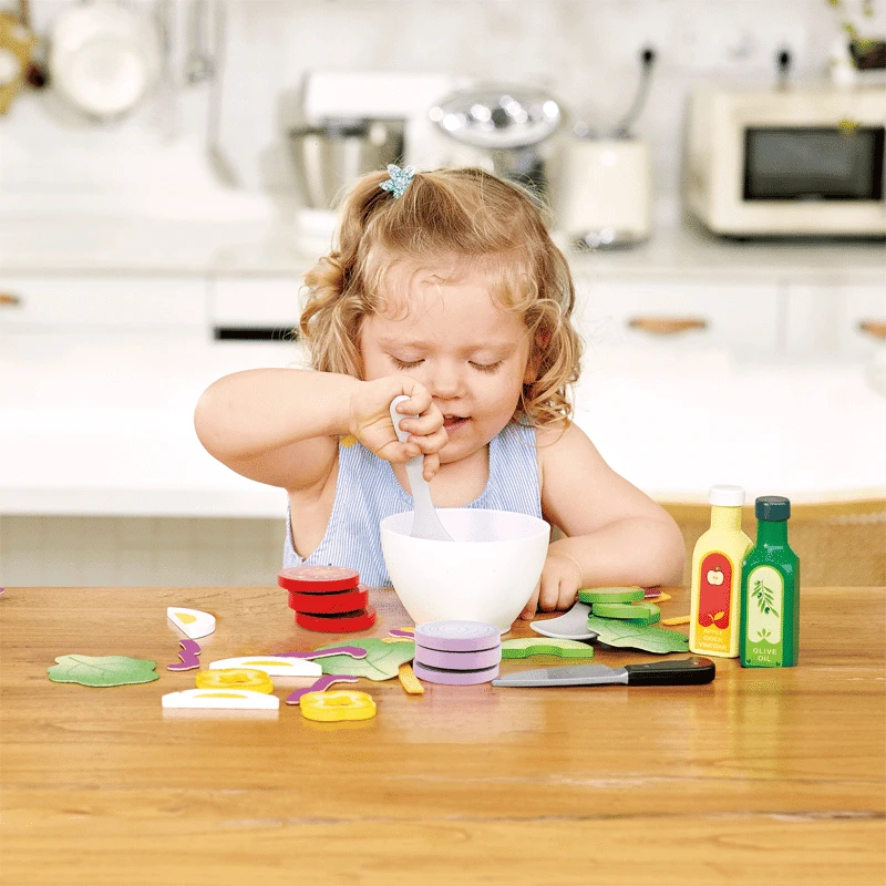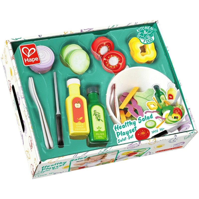 Valmista terveellinen salaatti hapen salaatti ruokasetillä! Setissä on munan, avokadon, kurkun, tomaatin, sipulin ja muiden vihannesten paloja. Jotkin palat saa tarroilla kiinni toisiinsa, ja ne voi paloitella leikkiveitsellä. Mukana tulee myös salaattikulho, kaksi isoa lusikkaa sekä kaksi salaattikastike pulloa.