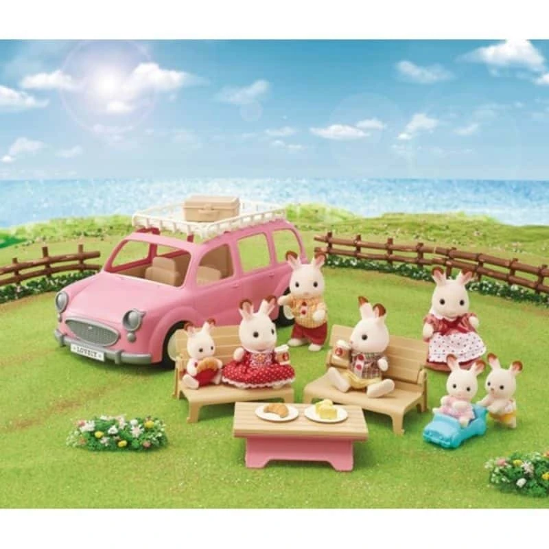 Lähdetään retkelle koko perhe Sylvanian Families-tila-autolla. Vaaleanpunaiseen tila-autoon mahtuu koko perhe, 8 hahmoa, ja kaikki iloitsevat mukavasta piknikistä luonnon helmassa. Kummankin takapenkin käsinojat voidaan kääntää ja ne muuntuvat vauvaistuimiksi kolmosille. Perillä kimaltelevan järven rannalla voidaan tavaratilan luukku irrottaa ja muuttaa pöydäksi, ja molemmat takapenkit asetetaan pöydän viereen. Kattotelineellä olevasta piknikkorista löytyy herkullisia eväitä ja astiat. Kun kattotelineen irroittaa ja kääntää ympäri, se muuttuu hauskaksi hyppyruudukoksi lapsihahmoille. Sylvanian Families -tila-auto on 26 cm pitkä. Ei sovellu alle 3-vuotiaille lapsille.