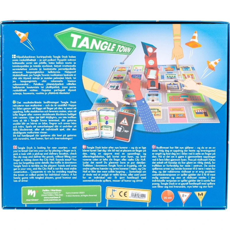 Kilpailuhenkinen kuriiripalvelu Tangle Dash hakee uusia ruokalähttejä – ja sait paikan! Hyppää autoosi laittamalla sormi sen päälle, katso keikan nouto- ja toimituspaikka ja toimita murkinat, tietysti irrottamatta sormiotettasi autosta ja kaatamatta paraatipaikalla seisovaa kaupungintalon kellotornia. Helppoa? Mahdollisesti, jos Tangle Townin ruuhkainen keskusta ei olisi niin täynnä autoja ja muiden pelaajien käsiä, tai jos kaupungintalo olisi rakennettu hieman vakaammaksi… Pelatkaa yhteistyöpelinä vältellen kellotornin kaatumista tai yksilöpelinä, jossa paras ruokalähetti voittaa. Hupaisa perhepeli täynnä solmuja, huumoria, vauhtia ja yllättäviä tilanteita!