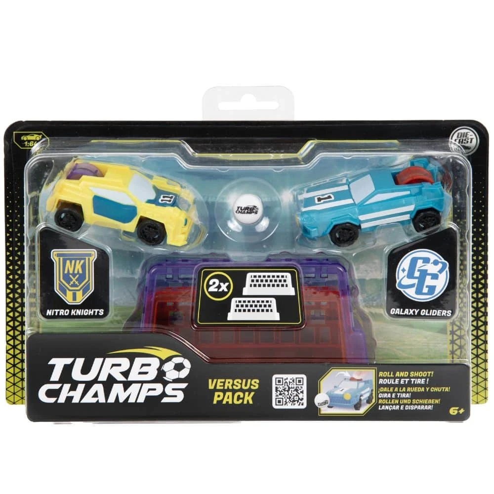 - Pakkaus sisältää kaksi Turbo Champs -ajoneuvoa, pallon ja kaksi maalia.